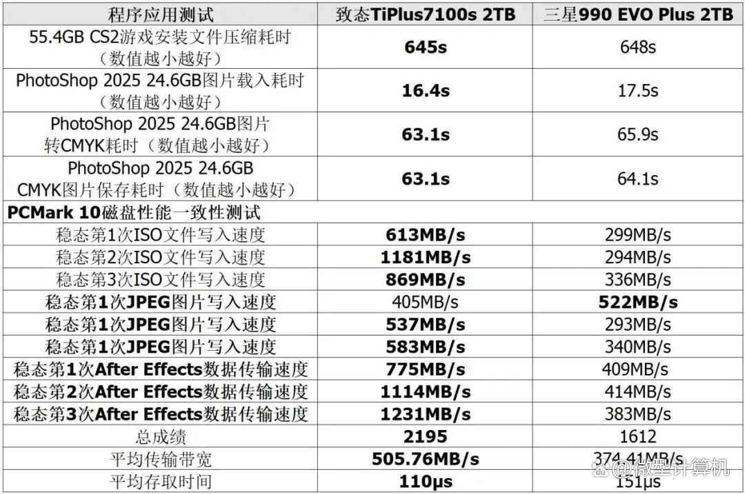 根本原因还是在于致态tiplus7100s 2tb在稳态下的各类应用中有更好的表现,比如在写入4个总容量20gb的iso文件测试中,致态tiplus7100s 2tb的3次稳态写入速度分别为613mb/s、1181mb/s与869mb/s,而三星990 evo plus 2tb的3次稳态写入速度分别只有299mb/s、294mb/s与336mb/s,差距极大。在写入339张jpeg图片,总容量为2.37gb的文件时,致态tiplus7100s 2tb的3次稳态写入速度分别为405mb/s、537mb/s与583mb/s,三星990 evo plus 2tb的3次稳态写入速度各为522mb/s、293mb/s与340mb/s。可以说,三星990 evo plus 2tb只坚持了1次测试,速度便迅速衰减,致态产品则“越战越勇”。