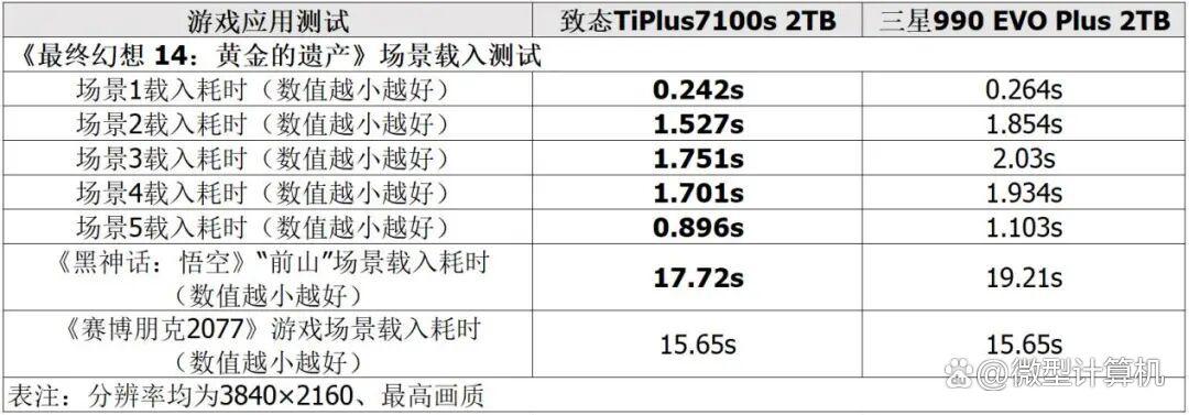 而在《黑神话:悟空》这个复杂、庞大的游戏中,其游戏场景载入耗时比很多游戏都要长得多。不过借助致态tiplus7100s固态硬盘强悍的随机与顺序读写性能,它在4k分辨率、影视级画质设置下,载入该游戏“前山”场景的耗时只有17.72s。三星990 evo plus 2tb载入相同场景的耗时则需要19.21s,仍多耗时8.4%。对三星产品而言,唯一的安慰是在《赛博朋克2077》中,两款产品终于打平,在4k分辨率、光追超速画质设置下,两款固态硬盘载入游戏场景的耗时均为15.65s。