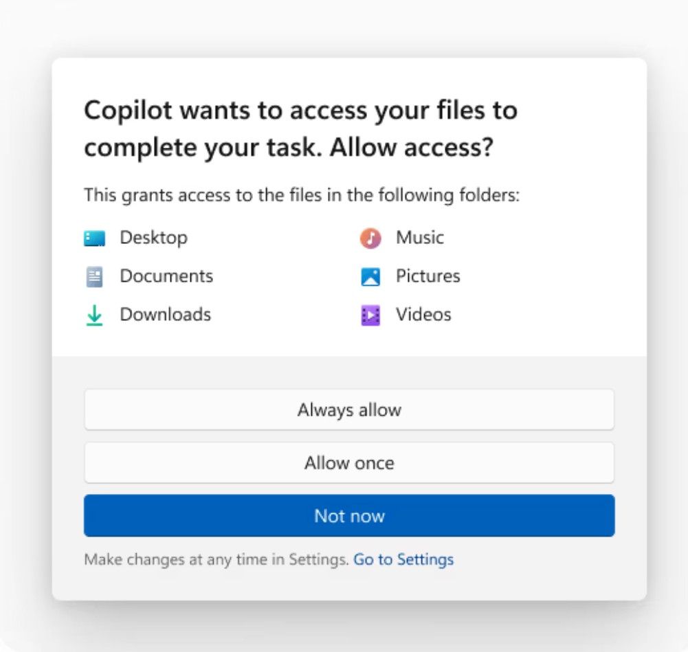 当然,用户仍可选择授权模式:允许智能体永久无限制访问、单次访问,或完全禁止访问。当 copilot 等人工智能智能体需要访问文件以完成任务时,系统会弹出授权弹窗,提供“始终允许”“仅允许一次”和“暂不允许”三个选项。