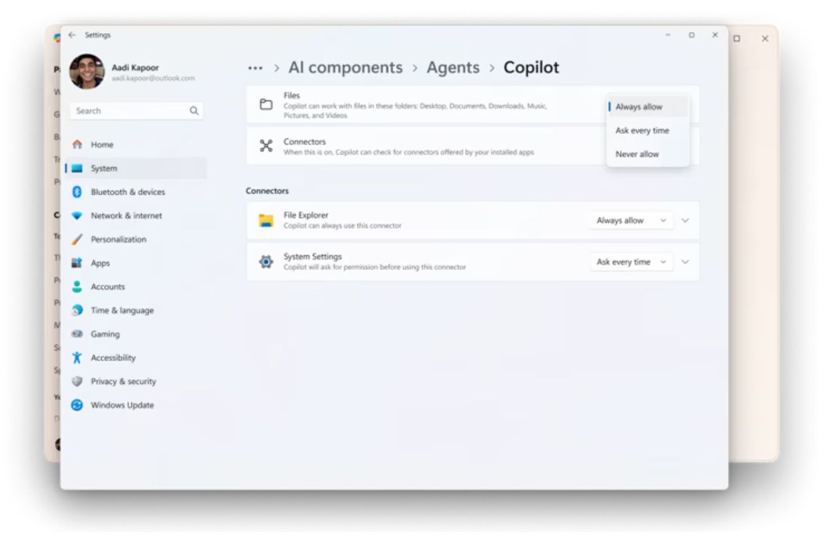 微软证实,在允许人工智能智能体访问存储于六个常用文件夹(包括桌面、文档、下载、音乐、图片和视频)的文件前,windows 11 会先征求用户的同意。用户也可为每个智能体单独自定义文件访问权限。