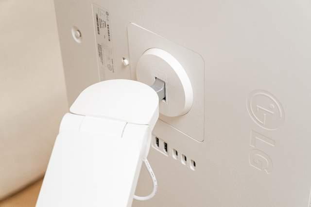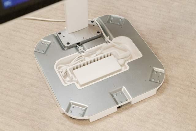 底座采用了方形加宽设计,与支架的力量感相呼应,带来了更好的稳定性。底座内藏有5颗可360度旋转的静音滚轮,女生单手也能轻松推动。电源适配器也隐藏在底座内,配合接口隐藏式收纳,减少了外露的线缆,除了让机身更加简洁,也能让机身在移动时不会受到电源线的影响,能轻松从书桌推到客厅、卧室,一台屏覆盖多场景。需要注意的是,lg swing移动屏没有内置电池,所以是要接电源线才能使用的。
