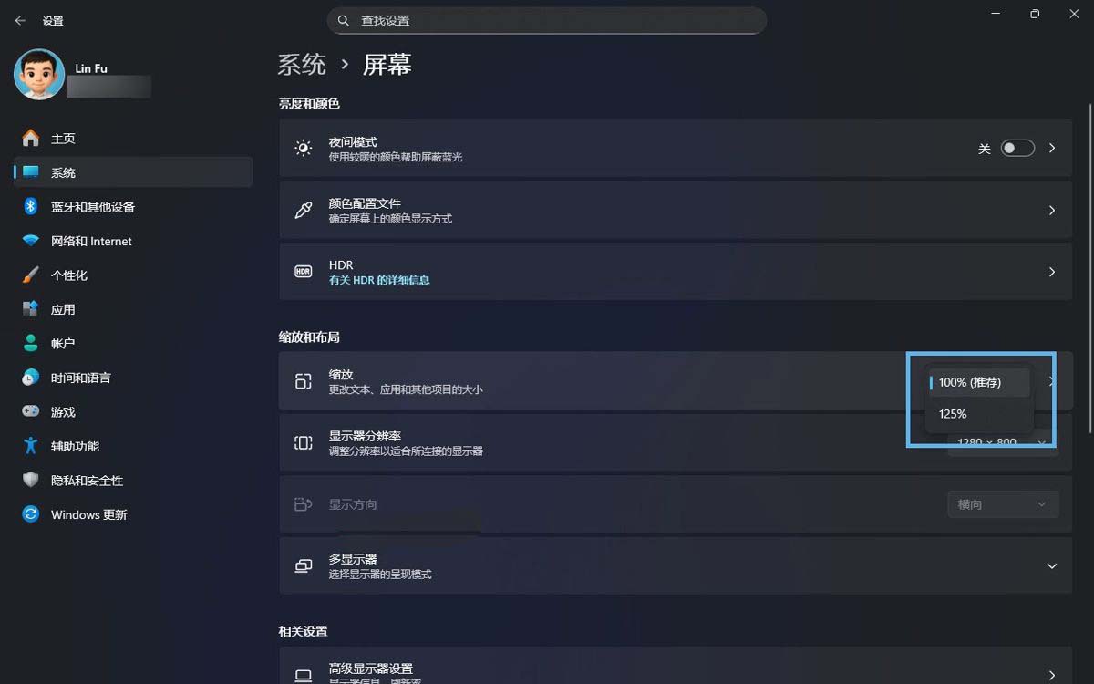 选择 windows 11 缩放比例