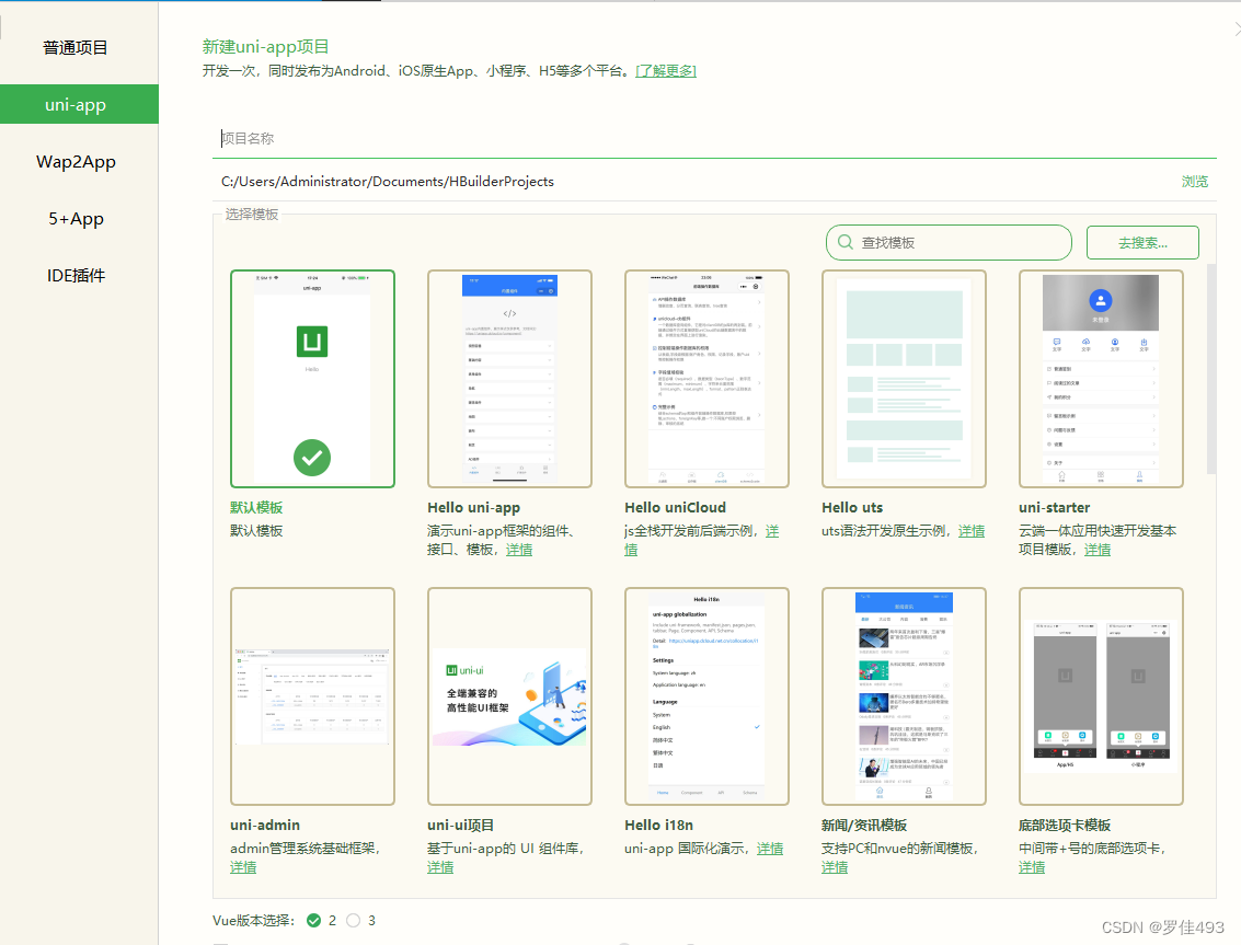 选择uni-app ->填写项目名称 ->默认版本-> vue版本2-> 点创建