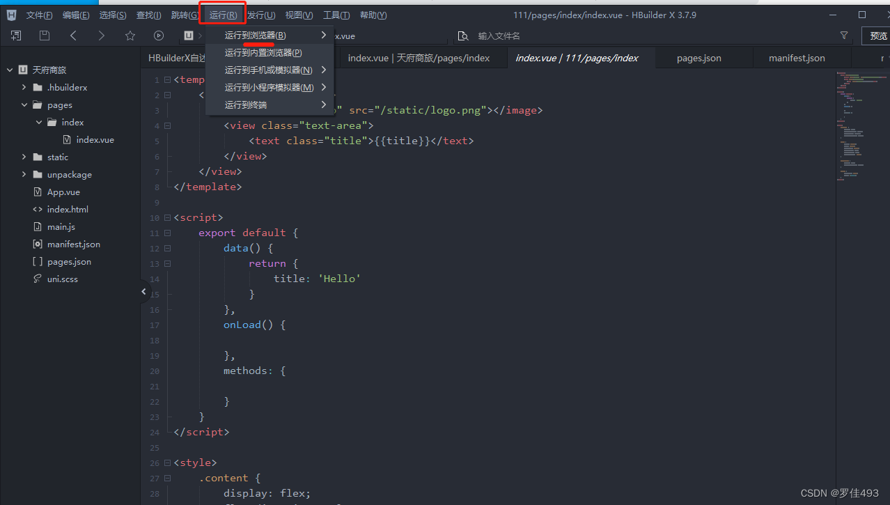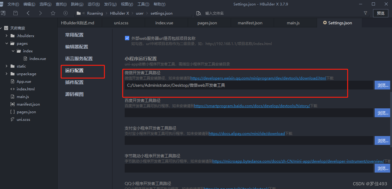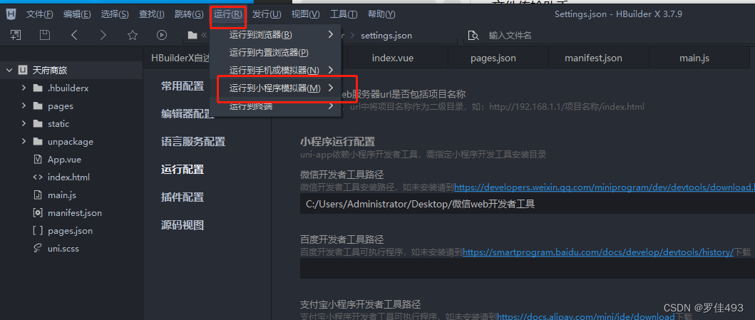 在HBuilderX 中找到运行-> 选择运行小程序模拟器->选择运行设置
