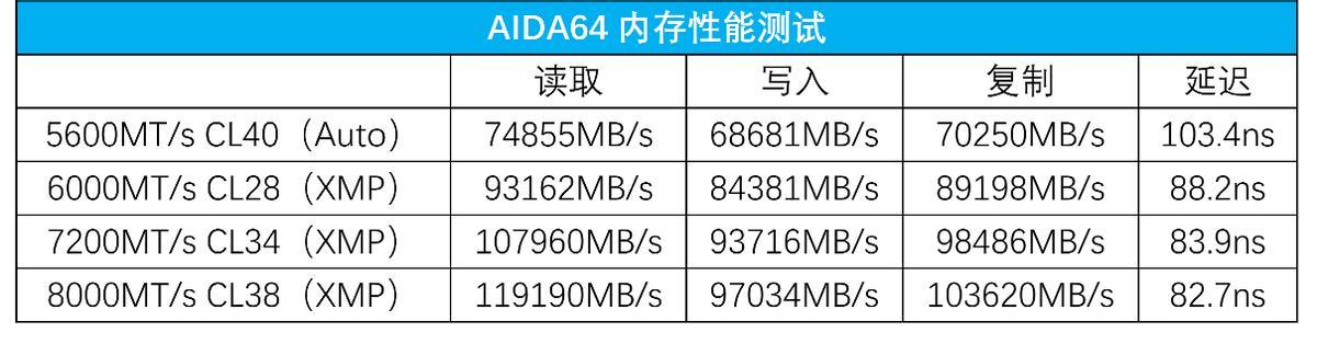 先来看看aida64的内存性能测试表现,可以看到内存的读写性能随着内存频率同步提升。其中5600mt/s到6000mt/s的综合带宽提升了约24%,6000mt/s到7200mt/s提升了约11%,72000mt/s到8000mt/s的提升约为6%。而在延迟方面,除了5600mt/s之外,6000mt/s、7200mt/s、7200mt/s的延迟都在90ns以内,6000mt/s到8000mt/s的内存延迟只降低了5.5ns。