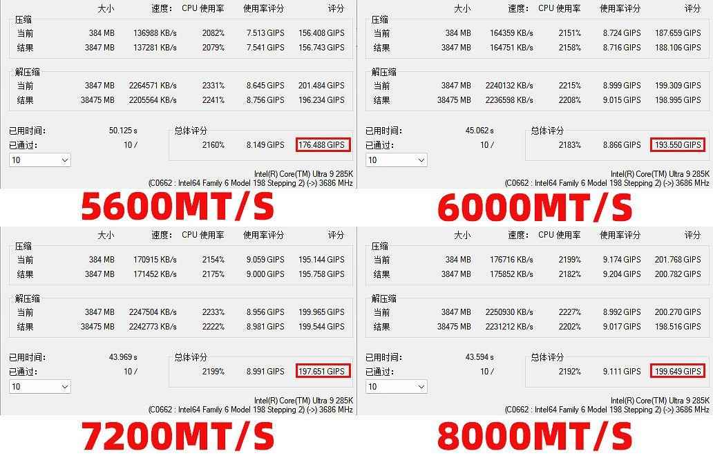 7-zip的基准测试,可以测试电脑的压缩和解压缩能力,对于内存性能比较敏感。从5600mt/s到8000mt/s频率,7-zip的性能也有着显著的提升,不过另外三种频率间的评分差距不大。