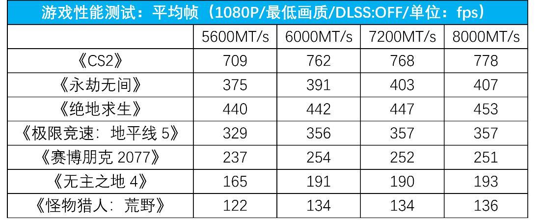在这两款对内存敏感的软件测试中,酷睿ultra 200s上高频内存会带来更高的读写速度以及更低的延迟,7200mt/s以上的高频内存相比最基础的5600mt/s的频率确存在一些优势,但都没有和“6000mt/s频率内存拉开差距。接下来,我们再实测内存频率对游戏性能的影响。