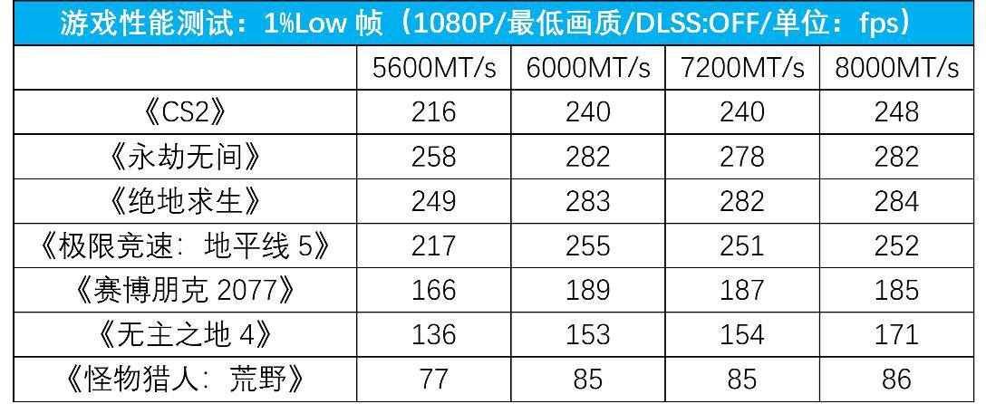 游戏的1%low情况和平均帧类似,5600mt/s到6000mt/s的提升最大,平均提升幅度约13%,体现到帧率上就是20帧以上的差距,对电竞游戏来说还是有意义。6000mt/s到8000mt/s则几乎没有区别,《无主之地4》没有benchmark,所以可能是手动测试的误差,其他几款游戏完全可以看作是同一性能水平上的表现。