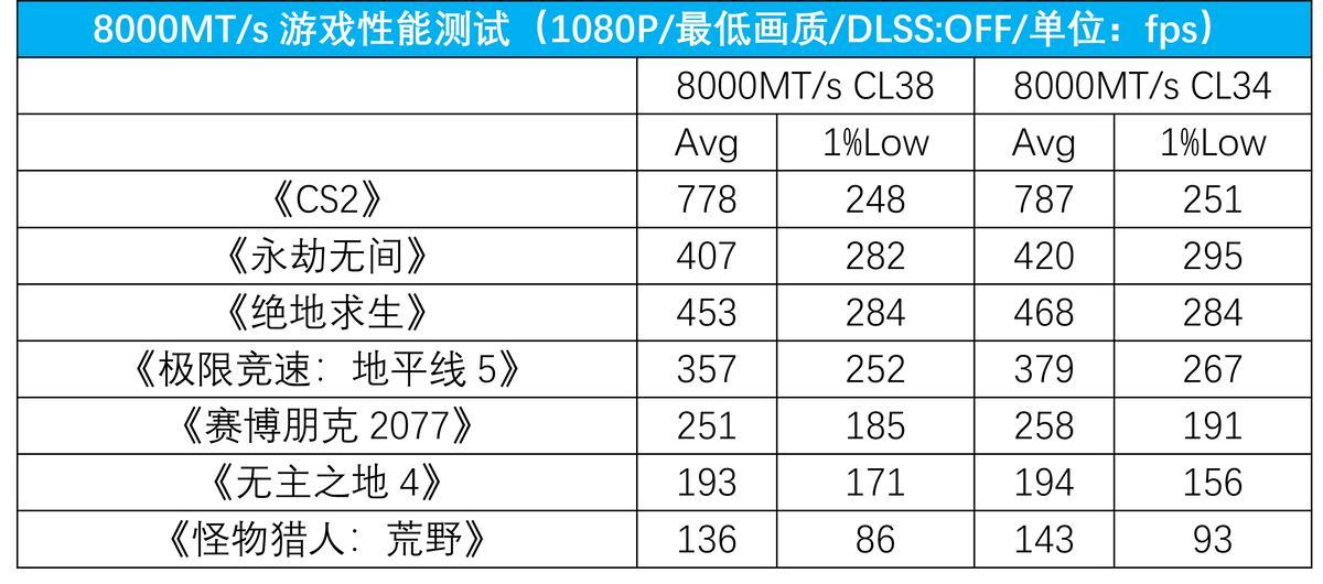 那么高频内存对游戏性能真的就没有提升吗?鉴于之前8000mt/s内存的延迟和6000mt/s内存的延迟都是80ns的水平,为了进一步探究高频内存低时序下的表现,我们开启了xmp tweaked模式获得更紧的小参,并在此基础上超频到了8000cl34。在超频状态下,8000mt/s内存的带宽得到了进一步提升,同时延迟降低了9.8ns。游戏性能方面,平均帧提升了约3%,1%low帧提升了约2%,相对6000mt/s内存提升了约4%,依然没有很明显的性能优势。