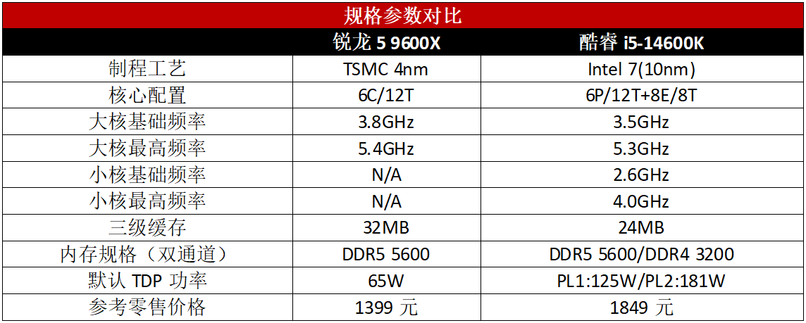 通过简单的对比,孰优孰劣就很明显了。两款处理器实际上都是6核12线程的配置,锐龙5 9600x 5.4ghz的核心频率更高,超频实现起来也更简单,同时32mb的三级缓存也多出了33%,无论游戏吃频率还是吃缓存,都能很好地应对,提供更好的游戏性能。