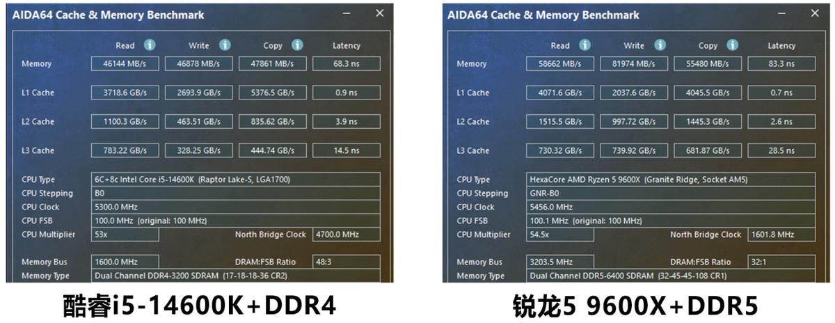 由于两款处理器搭配的内存不同,必然在性能上有一定的差异。锐龙5 9600x搭配的是ddr5 6400mt/s内存频率是ddr4 3200mt/s的两倍,所以在内存带宽上优势明显:锐龙5 9600x+ddr5平台的读取带宽为58662mb/s、写入带宽为81974mb/s、拷贝带宽为55480mb/s,酷睿i5-14600k+ddr4平台的相关成绩为46144mb/s、46878mb/s、47861mb/s,领先幅度分别为27%、74%、15%。