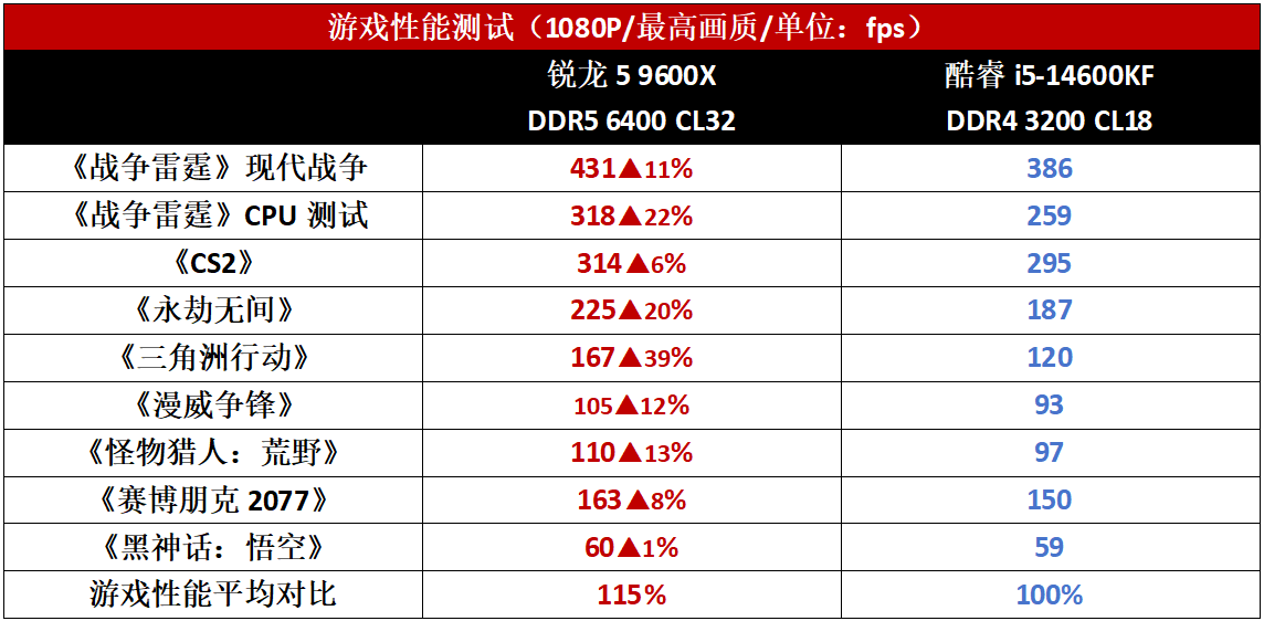 在实际的游戏测试中,显然内存高带宽比低延迟对平台游戏性能的影响更大,这在网络游戏中表现得最为明显。在《三角洲行动》中,锐龙5 9600x+ddr5平台获得了167fps的平均帧率,相较于酷睿i5-14600k+ddr4平台的120fps,领先幅度达到了39%。在《战争雷霆》cpu和《永劫无间》中,锐龙5 9600x+ddr5平台分别领先22%和20%,在《战争雷霆》现代战争、《cs》以及《漫威争锋》中,也有6%~12%的性能优势。综合所有测试项目,锐龙5 9600x+ddr5平台平均领先15%。