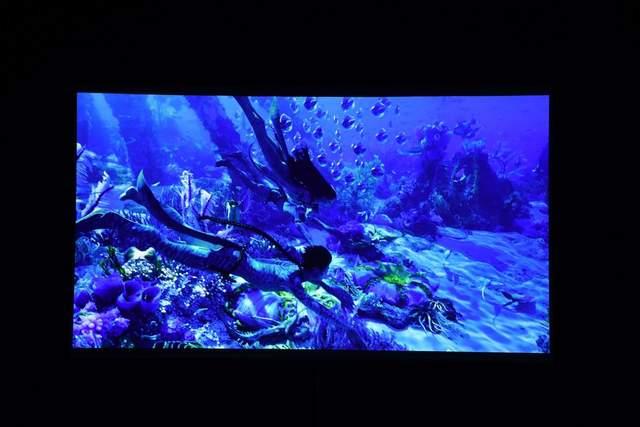 除了高亮度,3000000:1的超高对比度同样令人惊艳。播放《阿凡达2》的深海场景时,画面中的黑色深邃纯粹,没有泛白现象,而深海生物身上的荧光色则明亮鲜活,明暗过渡自然细腻。