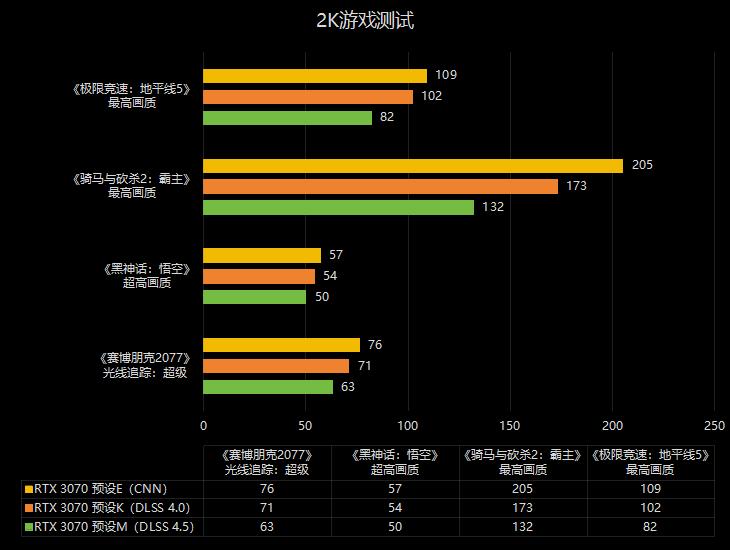 4k分辨率下,由于dlss 4.5使用的是l预设的超级性能模式,在《赛博朋克2077》《黑神话:悟空》中帧率还要高于cnn模型,在《赛博朋克2077》中帧率提升了约30%,但在另外两款游戏中,dlss 4.5的平均帧率仍然低于cnn模型。