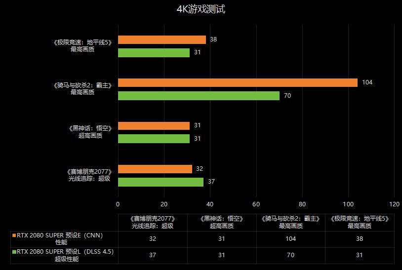 4k分辨率我们只测试了rtx 2080 super显卡,在《赛博朋克2077》中,dlss 4.5的帧率比cnn模型高约16%,《黑神话:悟空》和cnn模型持平。另外两款游戏的平均帧率分别下降了约33%和18%。