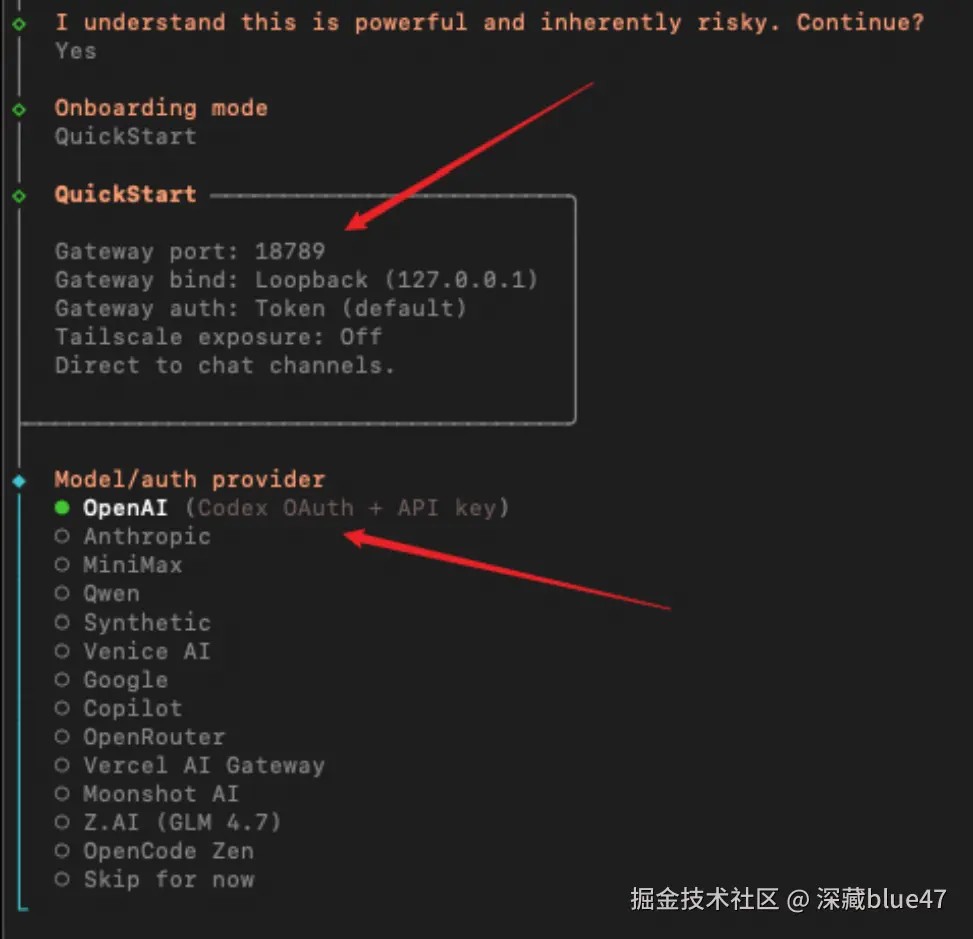 yes 继续。clawdbot 默认分配端口为 18789。