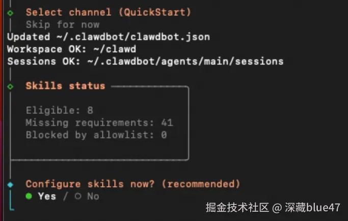 选择包管理工具(默认 npm 即可)。系统会推荐一些基础 skills,你可以按需选择,也可以全部跳过。 最酷的是: 后续你需要什么功能,直接在对话框跟 clawdbot 说“帮我安装某某 skill”,它就会自动安装,无需手动操作!