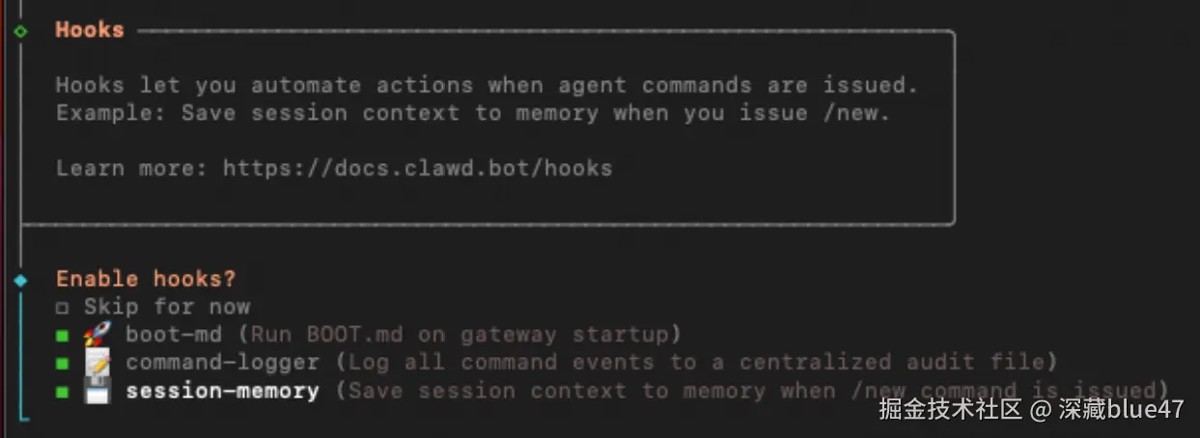 最后,系统会询问是否开启内置钩子脚本(hooks),建议全部开启以获得完整体验: