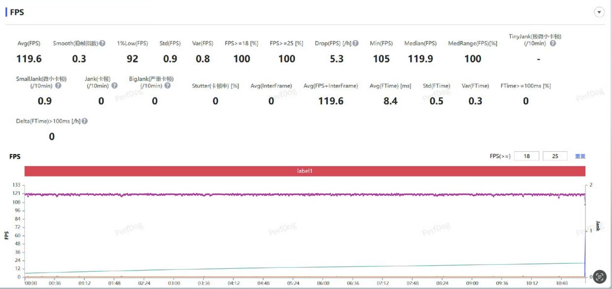 在实际测试中,铋读选择《王者荣耀》,在极致画质模式下可开启 120帧率。整场团战测试中,平均帧率稳稳保持在119.6fps,即便系统温度略有上升,也未出现“降频锁帧”或关闭插帧的现象。整个体验的关键词只有两个:顺滑与稳定。