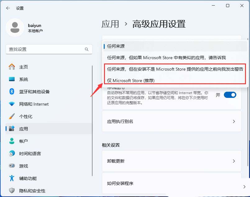 4、改为【仅 microsoft store (推荐)】或【任何来源,但在安装不是 microsoft store 提供的应用之前向我发出警告】;