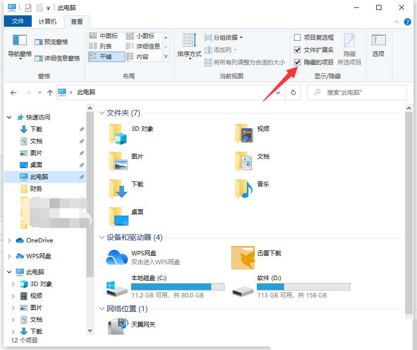 3、查看菜单中,找到并勾选隐藏的项目;