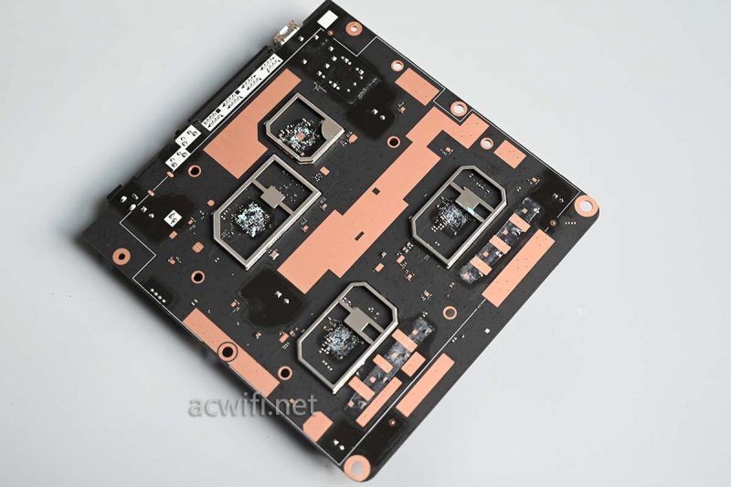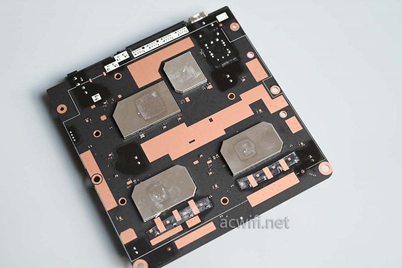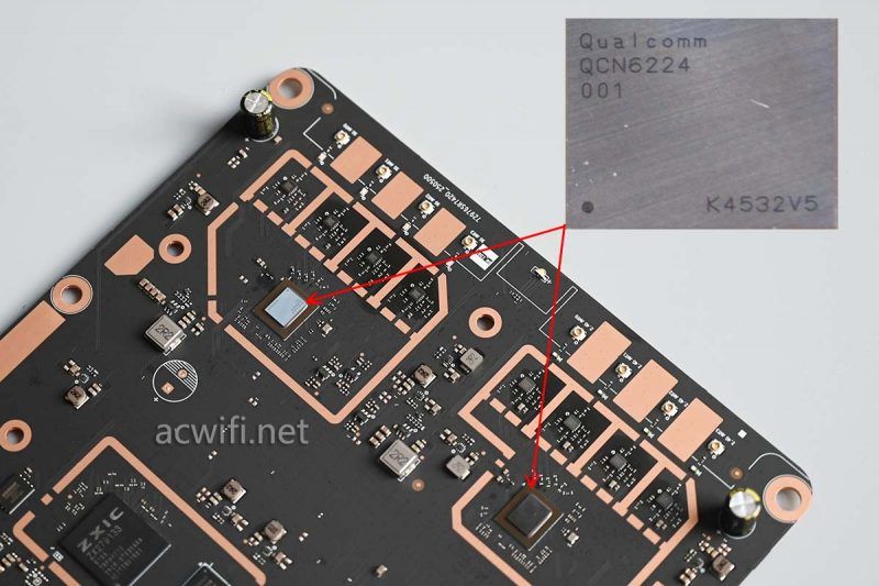2.4g和5g无线芯片型号都是高通的qcn6224,它可以工作在2.4g频段或5g频段,支持4x4mimo和4096-qam,2.4g最高速率1376mbps,5g最高速率为5764mbps,2.4g和5g的无线带机量均是128台。
