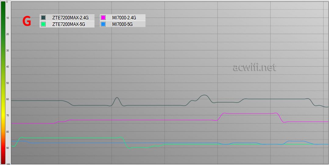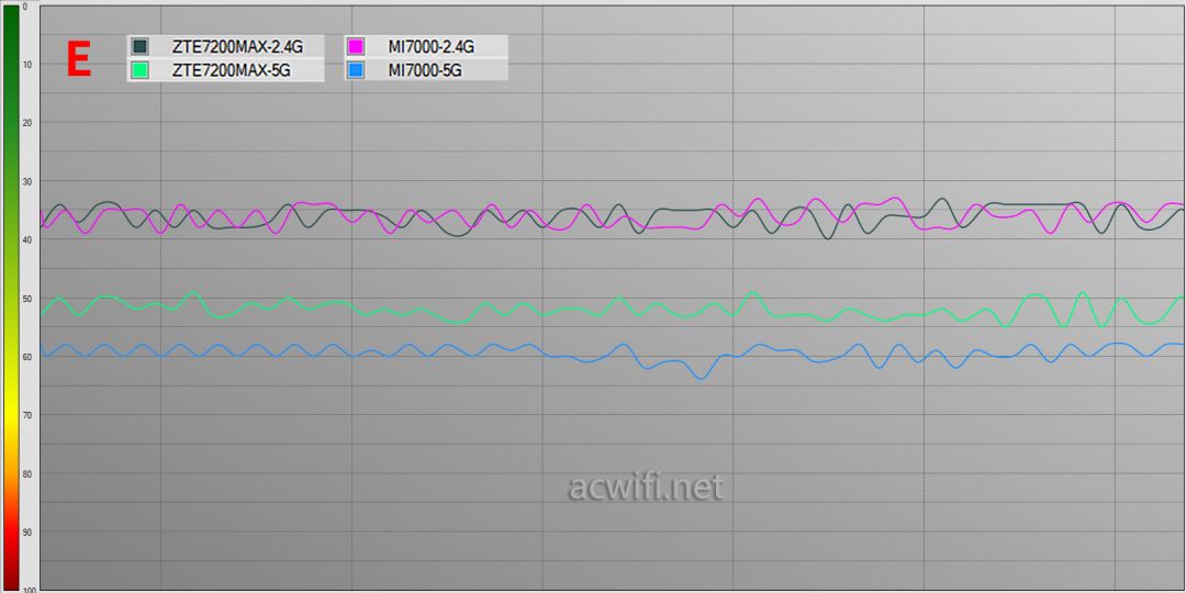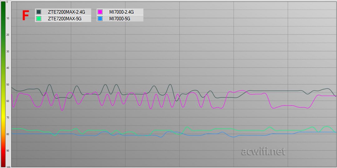 在隔了两堵 水泥墙的f点位置里,2.4g和5g的信号强度,两者相差不大,中兴问天be7200max相对较强一点点。