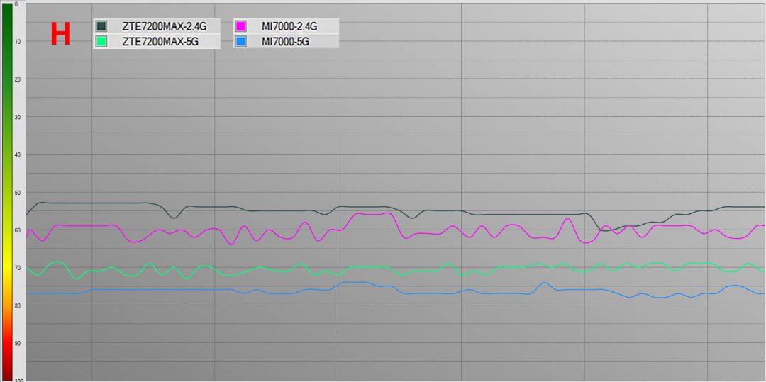 在最远的h点位置里面,2.4g和5g的信号强度,均是中兴问天be7200max强。