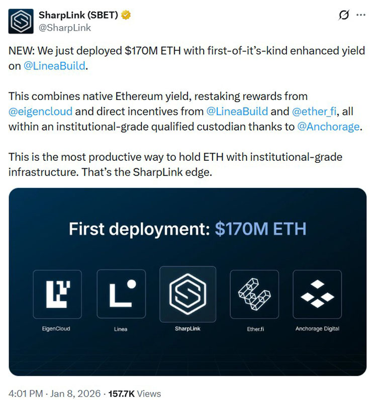 sharplink宣布,已向以太坊二层扩容方案linea追加部署了1.7亿美元的以太币,以获取额外的以太币再质押奖励,该公司于周四发布了这一消息。