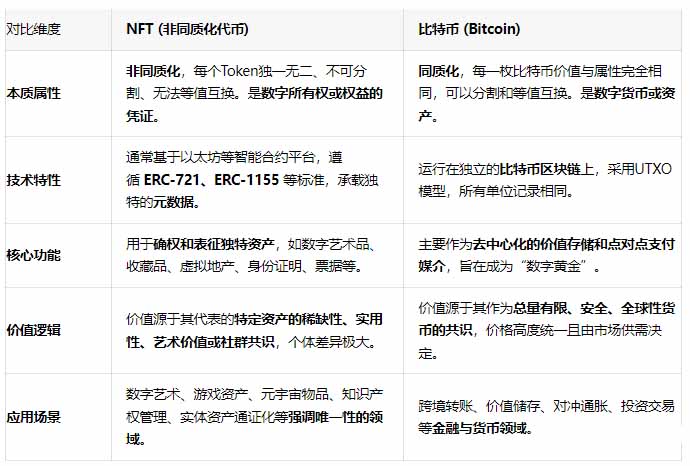 要把握nft的价值内核,必须首先厘清其与比特币等加密货币的根本不同。这种差异远非名称之别,而是源于底层逻辑与设计目的的彻底分叉。