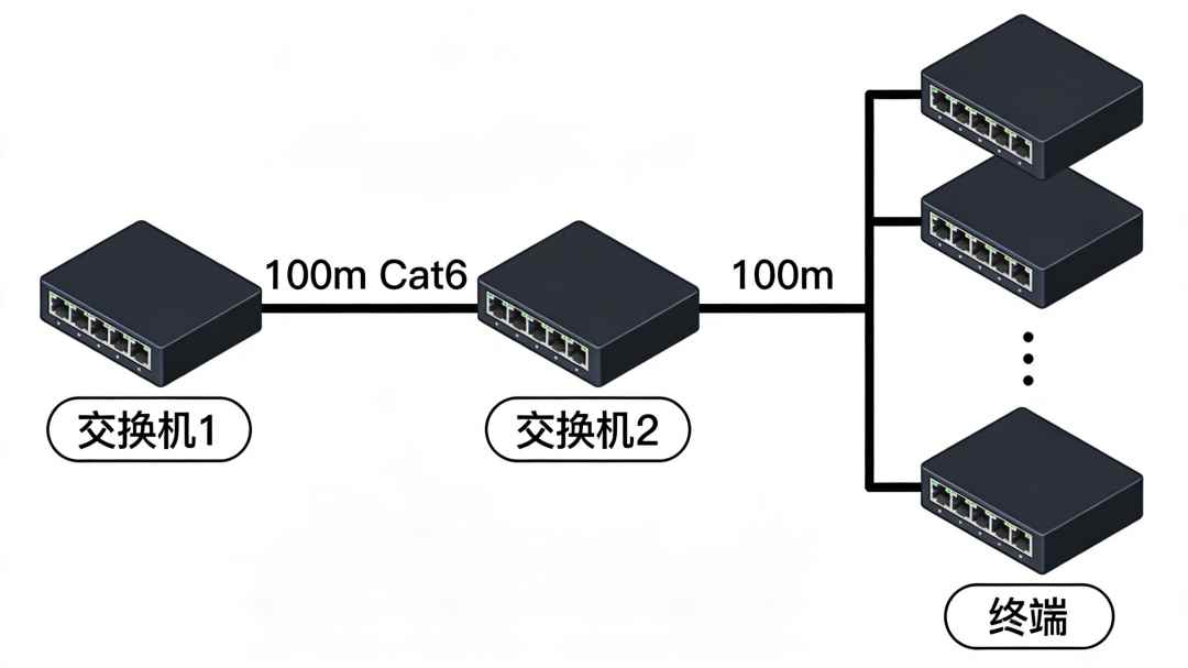 以太网(ethernet)基于ieee 802.3标准,使用双绞线(utp/stp)时,通道最大长度为100米(其中水平布线90米 + 跳线10米)。这不是随意定的,而是物理层信号传输的硬限制。