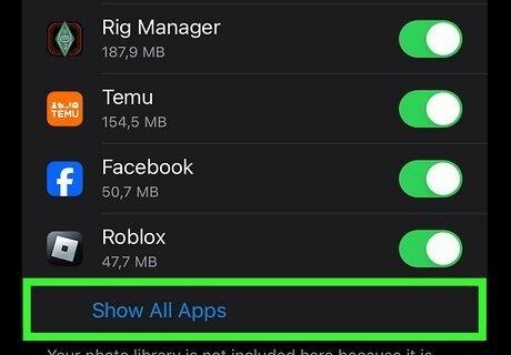 12. 点击显示所有应用来展开所有应用。这将显示已存储到您的icloud备份中的本地应用数据的完整列表。应用数据所占用的空间量会列在应用名称下方。