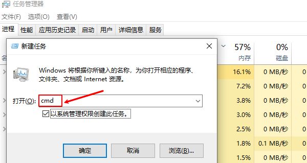 按下ctrl+shift+esc打开任务管理器→点击“文件”→选择“运行新任务”→输入cmd并勾选“以管理员身份创建此任务”。