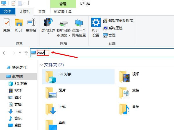在任意文件夹地址栏输入cmd并按下回车键,即可在当前目录下打开命令提示符窗口。