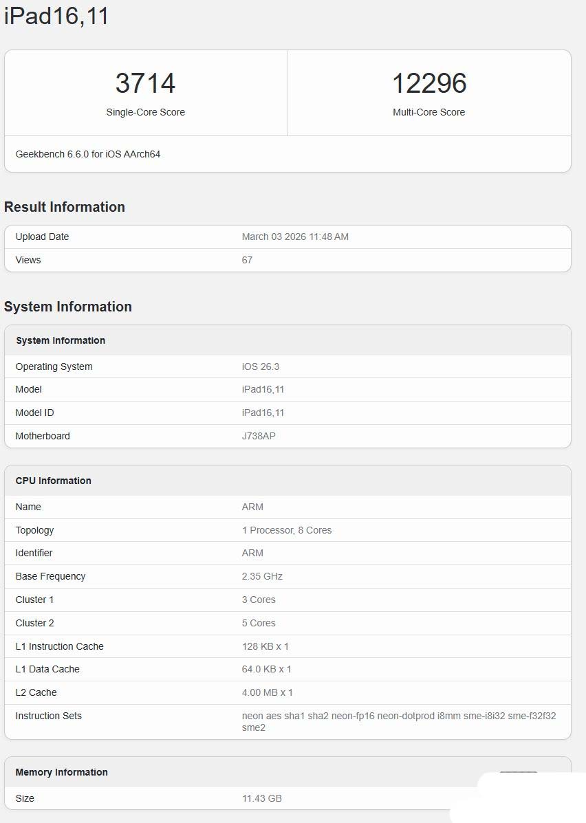 其 geekbench 6 单核得分为 3714,多核得分为 12296。作为对比,11 英寸m4 ipad pro 的单核跑分约为 3691,多核跑分则为 13663。