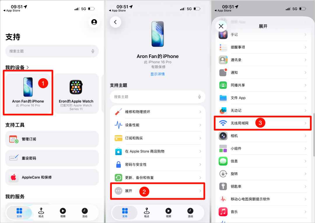 打开 apple 支持,点击我的 iphone - 展开 - 无限局域网