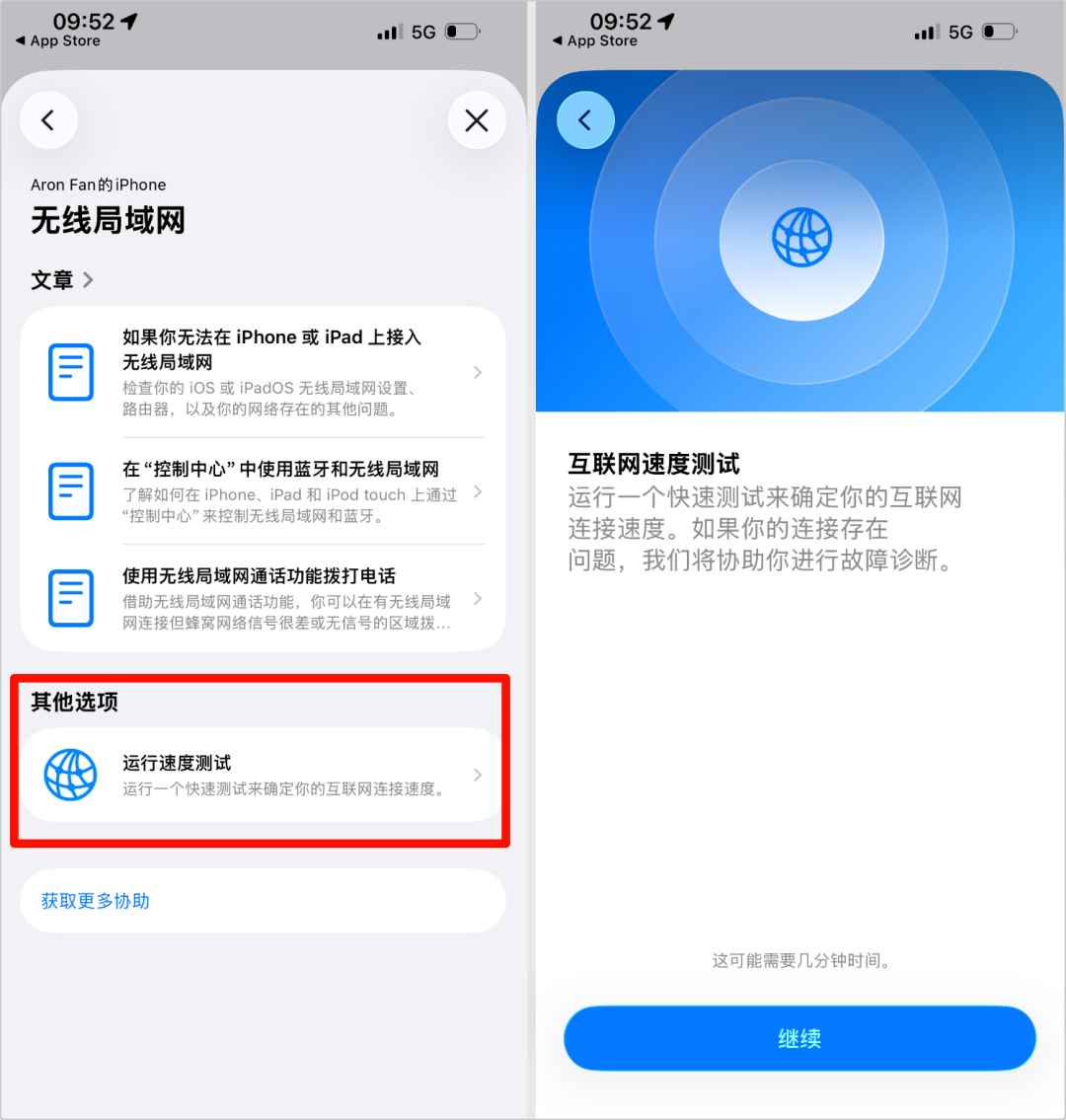 在这个页面中,新增了“运行速度测试”的功能,点击就可以开始进行苹果官方的网速测试