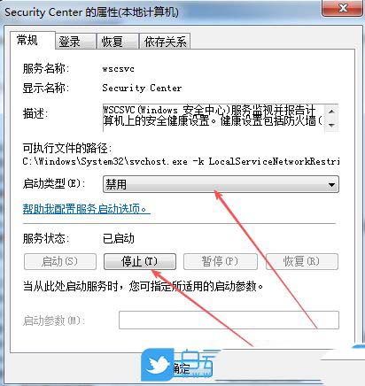 3、然后,设置启动类型为“禁用”,并点击停止其“服务状态”,再点击确定即可。