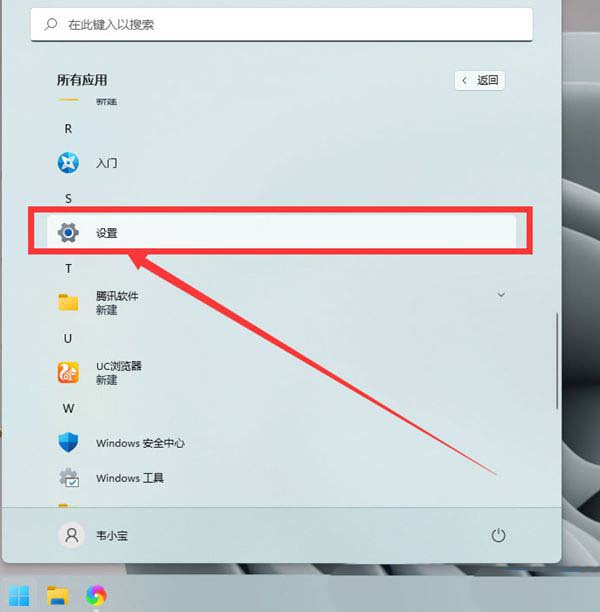 1、按 win 键,或点击任务栏上的开始图标,在所有应用下,找到并点击设置打开;