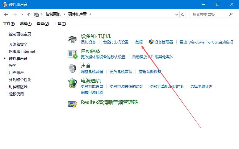 1、首先,打开win10系统的控制面板界面,点击打开“硬件和声音”设置。