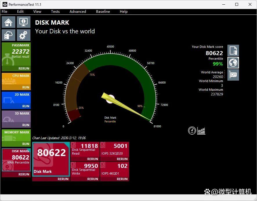 同时在as ssd benchmark、anvil's storage utilities测试中,长江存储pc550商用消费级pcie 5.0固态硬盘2tb凭借更好的顺序读写与随机读写性能,分别获得了12674分、34886.31分的优秀成绩。高端pcie 4.0 ssd在as ssd benchmark测试中的得分一般不到10000分,在anvil's storage utilities测试中的得分难以超过30000分。为了让读者更直观地了解长江存储pc550商用消费级pcie 5.0固态硬盘2tb的性能,我们还使用了可以排名的performancetest 11.1磁盘测试。其得分高达80622,可以击败全球99%的其他存储产品。
