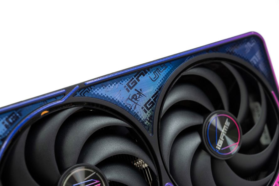 风扇中间的igame同心圆装饰贴片,并同样融入了蓝粉渐变的元素装饰。