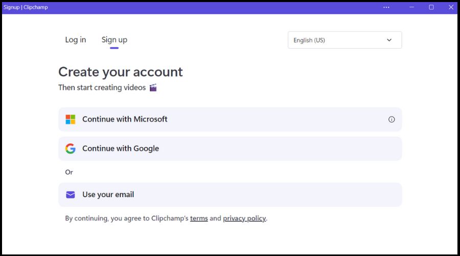 microsoft store 提供了一个应用程序,以便于使用在线工具。如果您无法在您的系统上安装该应用程序,最好的替代方法是使用网站,直到问题得到解决。如果您是clipchamp的新用户,只需注册服务并使用您的帐户登录。然后您可以在不安装任何应用程序的情况下在线编辑视频。