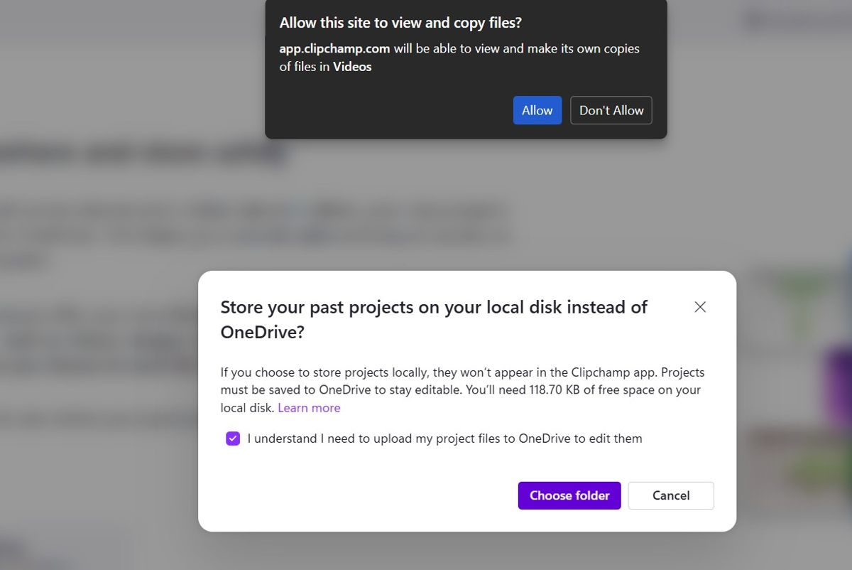 无论如何,现在要想使用 clipchamp 的唯一方式就是允许它将视频项目保存到 onedrive。任何在 clipchamp 中新编辑的视频都会自动在 onedrive 账户中创建项目文件。