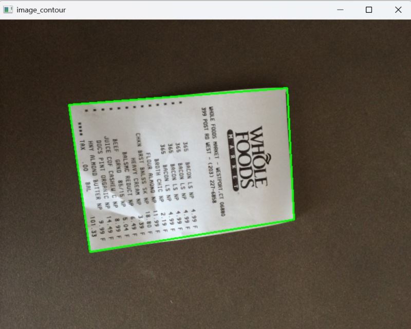 cv2.waitkey(0)screencnt 当前形状可能为 (4, 1, 2),通过 reshape(4, 2) 转换为标准的 (4, 2) 数组。ratio,将坐标从缩放后的图像空间映射回原始图像空间,确保透视变换在原始分辨率下进行,保留细节。four_point_transform(orig, ...) 对原始图像 orig 进行矫正,得到 warped。cv2.imwrite 将矫正后的图像保存为 invoice_new.jpg。xx 显示矫正后的图像,便于查看细节。运行结果展示: