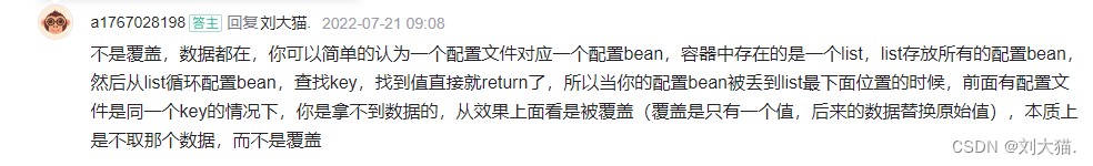 答案:如图1,你看红色框中你感觉prod在info下载加载,你会觉得prod相同的key会覆盖dev中的值,实际答案真不是这样,详情请看如图2这个人的回答。正常来说生产项目中application-dev.properties和application-prod.properties只会允许使用一个,才不会混用。