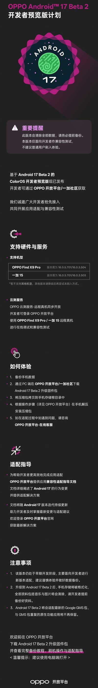 一加社区负责人 @帅蓝 今日在微博发文宣布,基于 android 17 beta 2 版本的 coloros 开发者预览版现已上线,oppo find x9 pro、一加 15 首批支持。