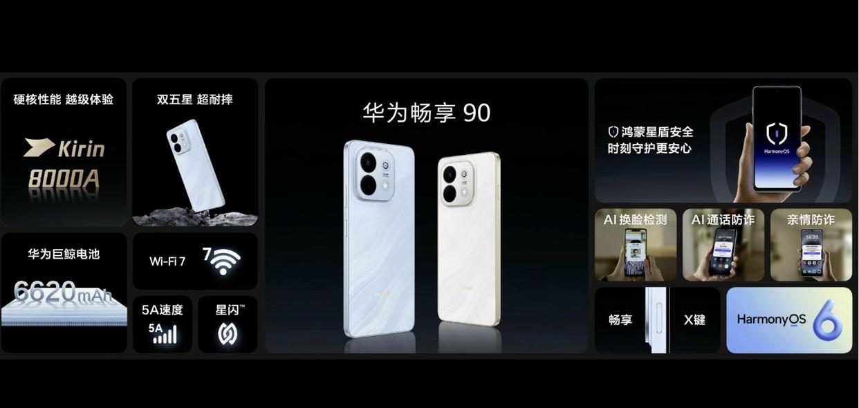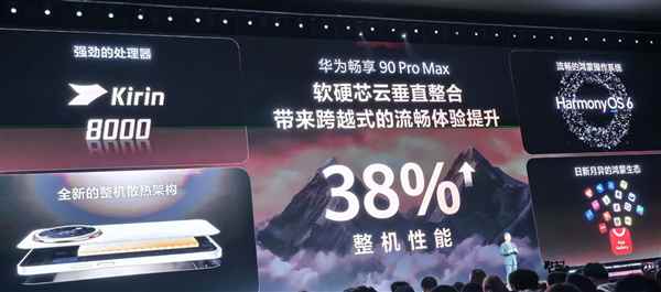 华为畅享90 pro max搭载麒麟8000处理器,整机性能提升38%,可以做到120帧《王者荣耀》连续5小时高帧体验。
