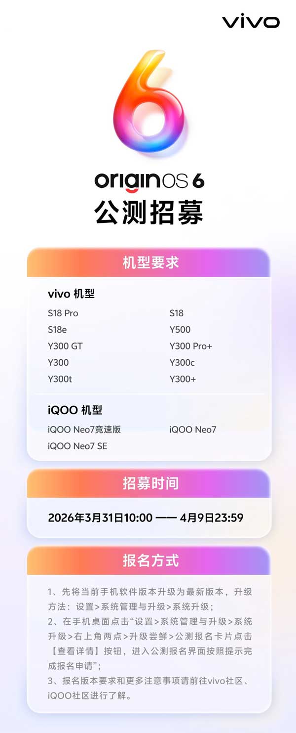 vivo 今日官宣,originos 6 新一轮的公测开启招募。附具体招募机型如下: