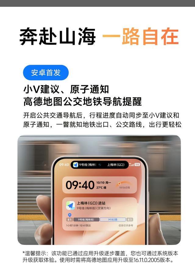 - 安卓首发小 v 建议、原子通知高德地图公交地铁导航提醒,开启公共交通导航后,行程进度自动同步至小 v 建议和原子通知。